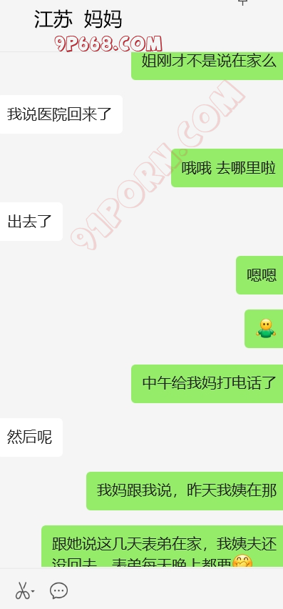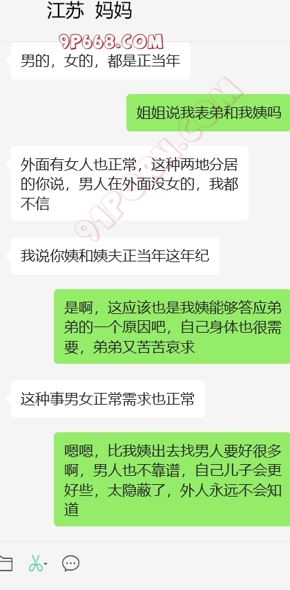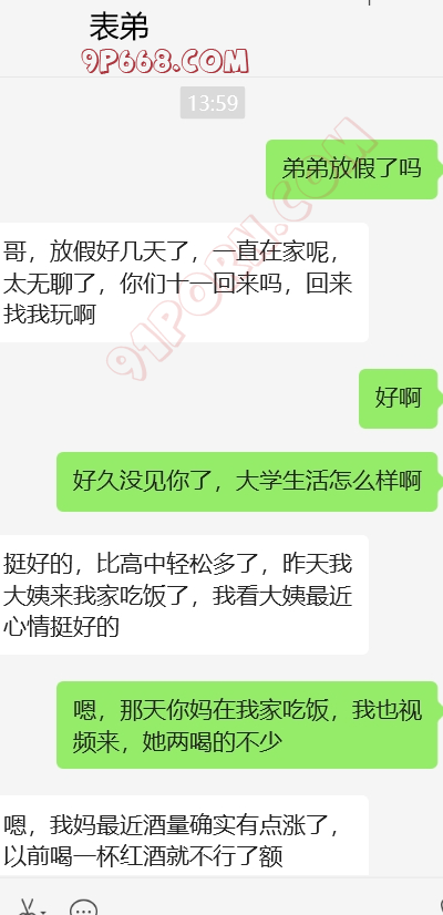 加入和表弟,我姨和我妈妈的4p话题,还有我妈妈和我姨的女女话题,哈。她还在那一本正经的帮我出主意,怎么才能4p。找了个粉丝,演我表弟,和表弟的对话发给她看。