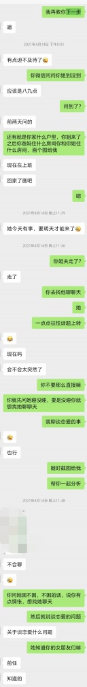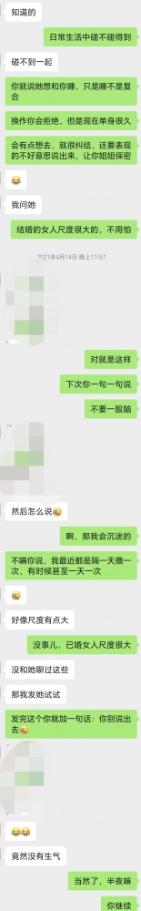 男生加了我的微信之后,急不可耐的要开始。我让他按住性子一步一步来。首先从恋爱的问题切入,谎称告诉男生的前任来找他复合,但是他很纠结。姐姐顺着话题问他为什么纠结,他就说怕沉迷。姐姐很纳闷,为什么会沉迷呢?因为…怕经常做爱——话题很自然切换到性,可以看聊天记录